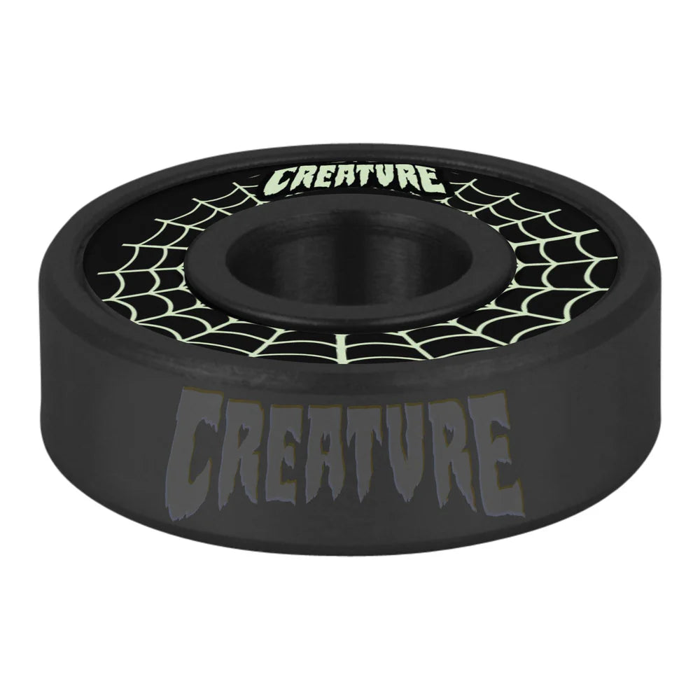 Bronson Speed Co X Creature Skateboards G3 bearing featuring spider web graphic shield art printed with super durable ink, 7 CREATURE and 1 FIENDS laser etched outside bearing races, and custom glow in the dark coffin box packaging. Bronson Speed Co. G3 Next Generation Bearings designed for today's skateboarding.