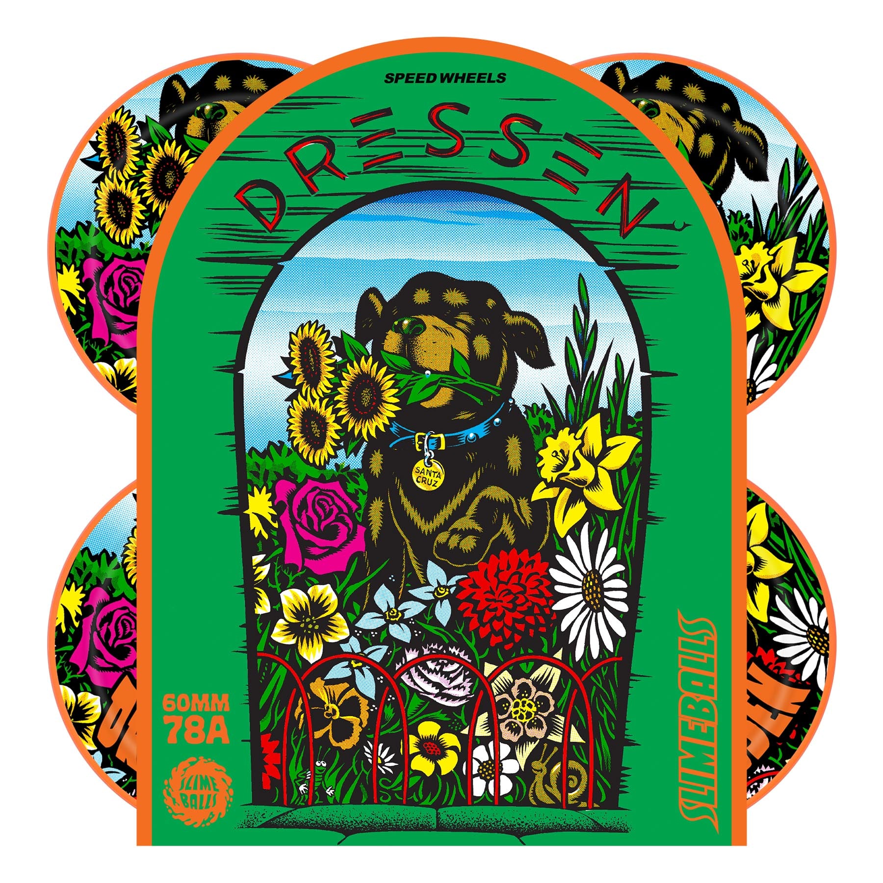 Slime Balls 60mm, 78a Eric Dressen Pup Reissue OG Slime wheels in orange with black core featuring Santa Cruz graphics originally drawn by Jim Phillips. OG Slime is a versatile, symmetrical center bearing cruiser wheel shape with soft, all terrain urethane. All Slime Balls skateboard wheels are sold as sets of 4. Wheel Diameter (Millimeters) 60.5 Wheel Durometer/Hardness 78a Road Surface (Millimeters) 30 Wheel Width (Millimeters) 40